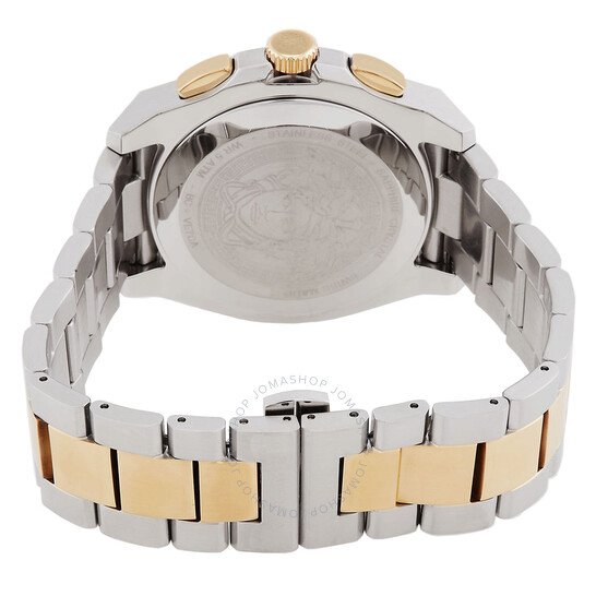 Versace Geo Chronograph Quartz Silver Dial Men’s Watch VE7CA0823 Two-tone (silver-tone and gold-tone) stainless steel case and bracelet. Fixed gold-tone bezel. Silver dial with gold-tone hands and index hour markers. Dial Type: Analog. Luminescent hands. Date display at the 4 o’clock position. Chronograph – three sub-dials displaying: 60 second, 30 minute and 1/10th of a second. Quartz movement. Scratch resistant sapphire crystal. Cushion case shape, case size: 43 mm. Buckle clasp. Water resistant at 50 meters / 165 feet. Functions: chronograph, date, hour, minute, second. Geo Series. Dress watch style. Watch label: Swiss Made. Versace Geo Chronograph Quartz Silver Dial Men’s Watch VE7CA0823.